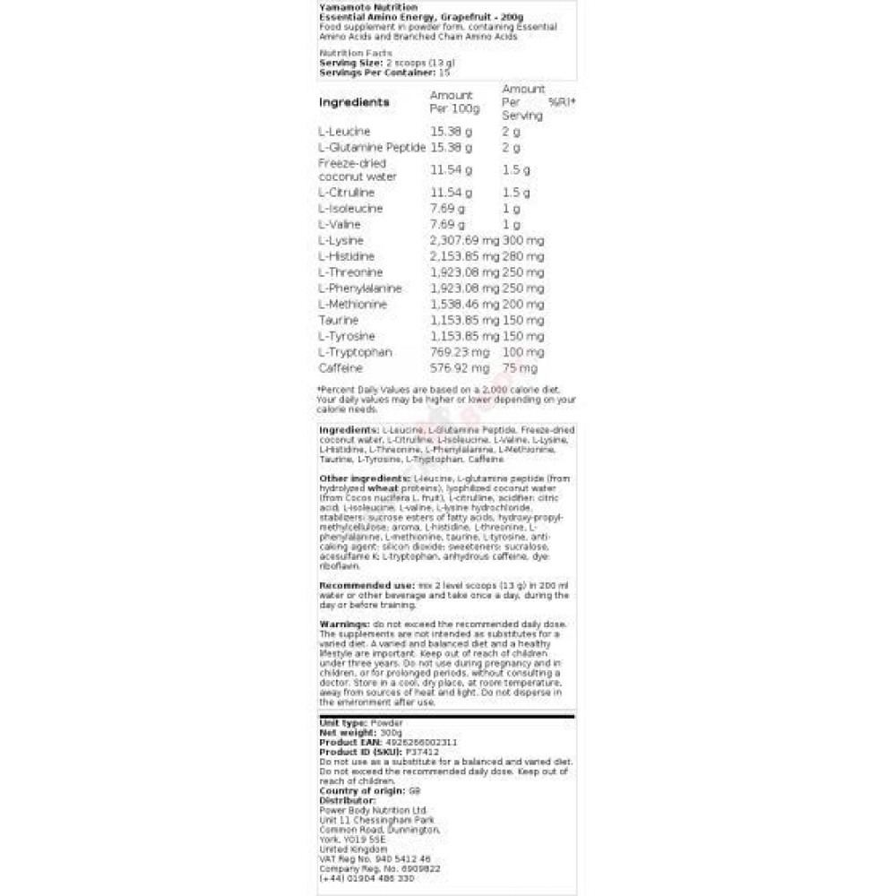 Olika beroende på varumärke och formulering (t.ex. AminoX, Optimum Nutrition Essential Amino Energy) |